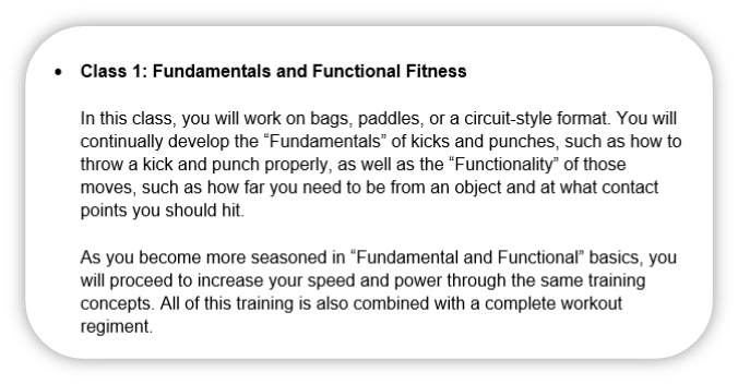 minutes of punching, kicking, and blocking techniques in an action packed atmosphere of Martial Arts base